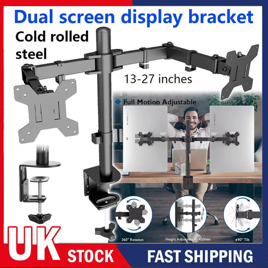 Double Twin Arm Desk Mount Bracket LCD Computer Monitor Stand 13”-27” Screen TV